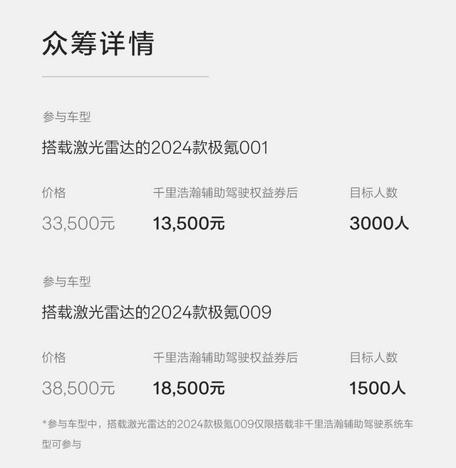 此次众筹时间为2025年11月24日12:00至2025年12月24日12:00,众筹对象为中国地区搭载激光雷达的非千里浩瀚辅助驾驶系统的2024款极氪001和极氪009车型,预计总数超过7万辆,规模之大业界罕见。